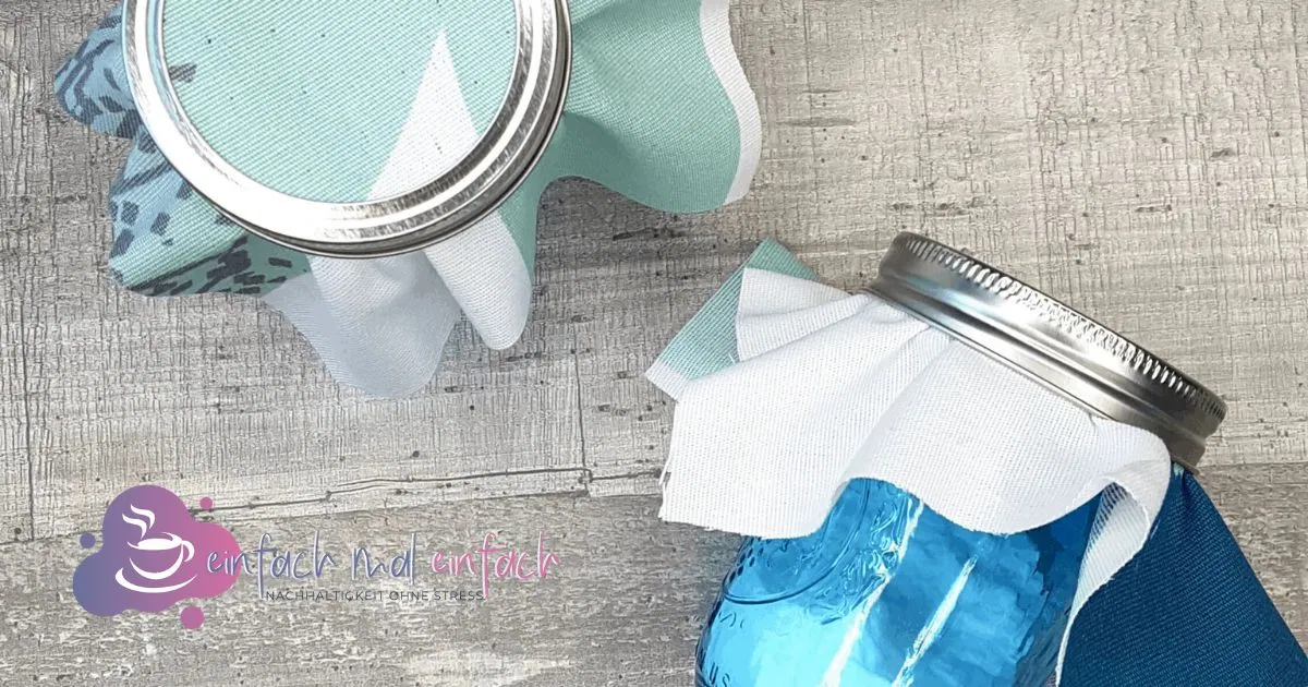 Falls Du kein Glas mit zweiteiligem Schraubdeckel zur Hand hast, kannst Du den Stoffrest auch mit einem Gummiband fixieren. Mit einem passenden Band oder Dekomaterialien lässt sich auch das noch optisch aufwerten.