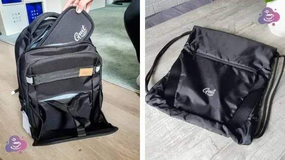 Der große GMT TREND PRO kommt mit passendem Schlampermäppchen und Zugband-Sporttasche – und die ist deutlich stabiler und wertiger als eine „Null-Acht-15“-Variante. Der kleine Zugband-Sportbeutel bietet nämlich ein großes Extrafach vorne, damit schmutzige Sportschuhe oder auch Geldbeutel und Snacks separat untergebracht werden können.